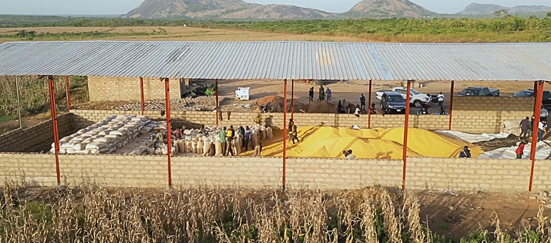 An elevated view of a facility showing large quantities of harvested grain (maize kernels) in piles and packed in sacks, illustrating the on-site storage and preparation for market.