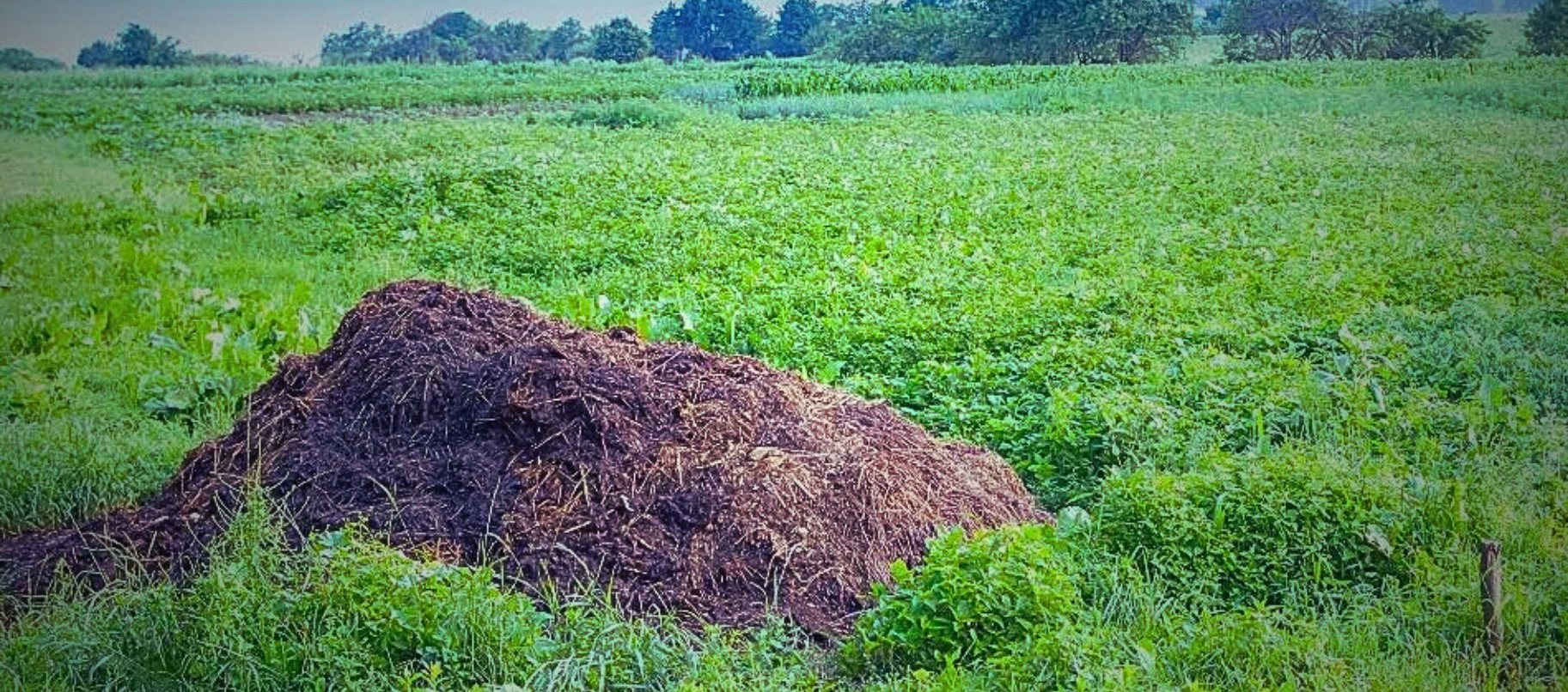 A massive pile of organic compost or manure ready to be spread onto a field of cover crops, illustrating a key sustainable practice for soil fertility.