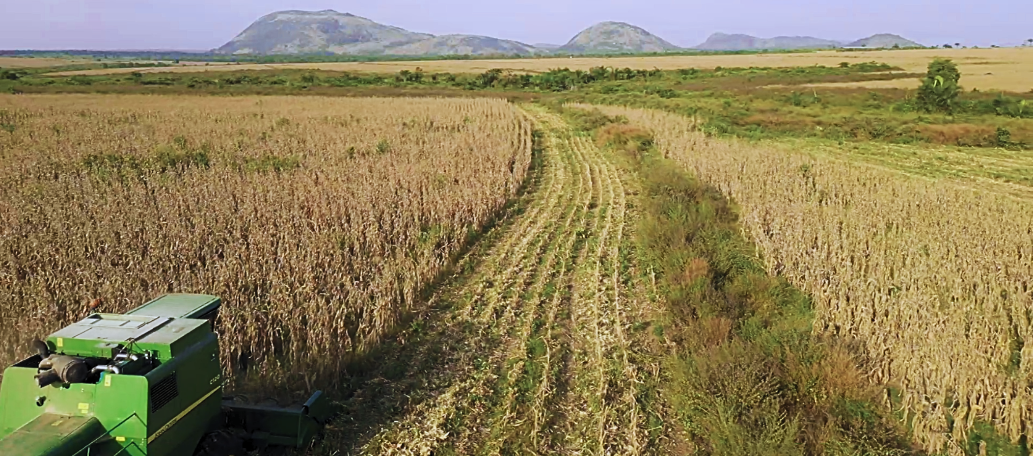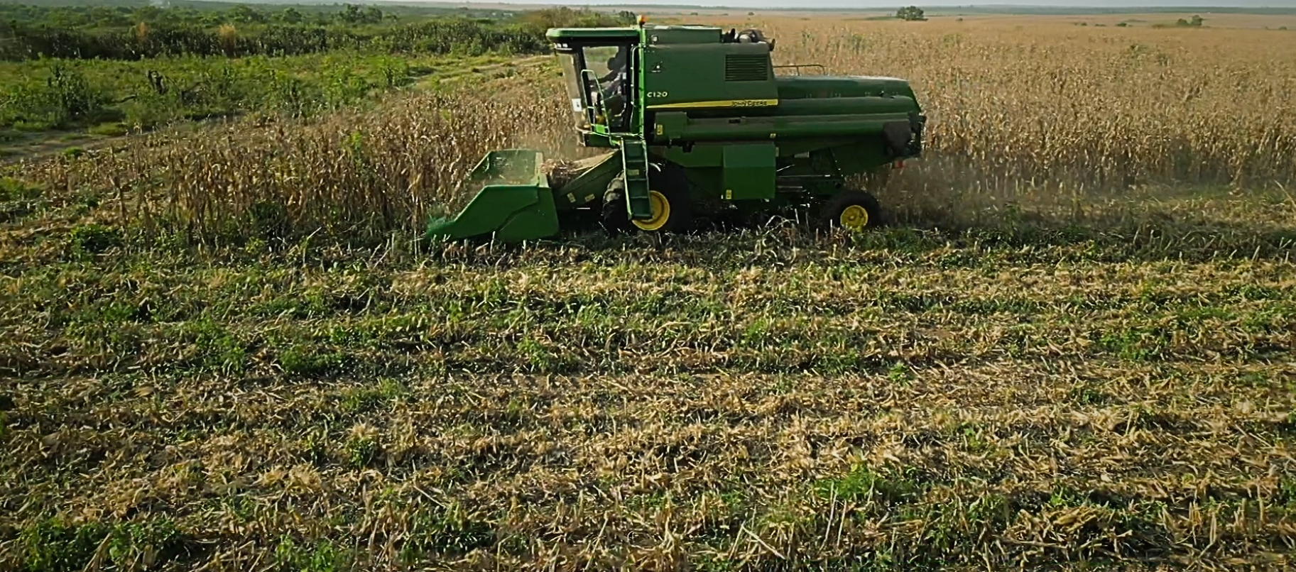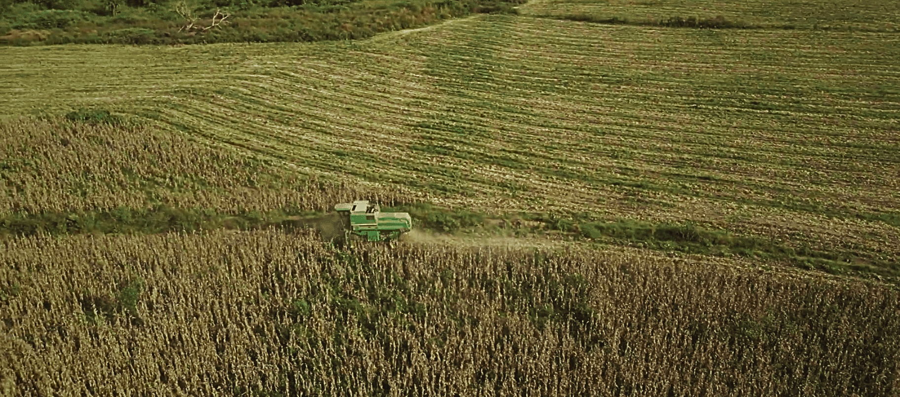An aerial shot of the vast maize field, contrasting the standing crop with the already harvested sections, highlighting the large area of the agricultural operation.